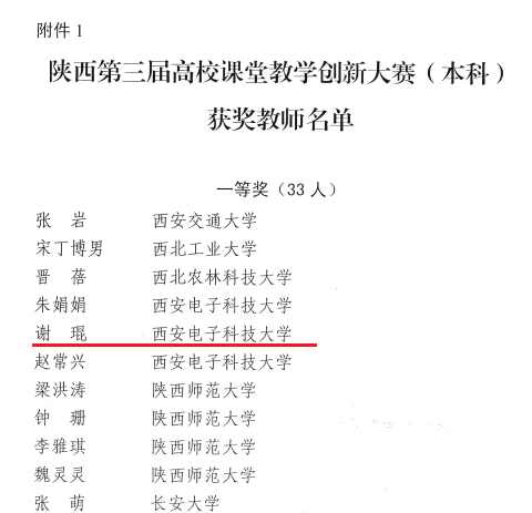 (通讯员 陈龙)日前,陕西省教育厅公布了第三届高校课堂教学创新大赛结果,我院谢琨老师获省级一等奖,取得该赛事开展以来我院最好成绩。