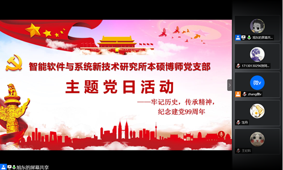 (通讯员 贺同庆)为庆祝建党99周年,重温党的光辉历史,传承弘扬革命先辈的奋斗精神,beat365亚洲体育在线官网智能软件与系统新技术研究所本硕博师联合党支部于2020年7月1日召开了“牢记历史,传承精神——庆祝建党99周年”主题党日活动。本次活动由支部青年委员王旭东同志主持,活动共计39人参加,采用腾讯会议线上召开的方式进行。